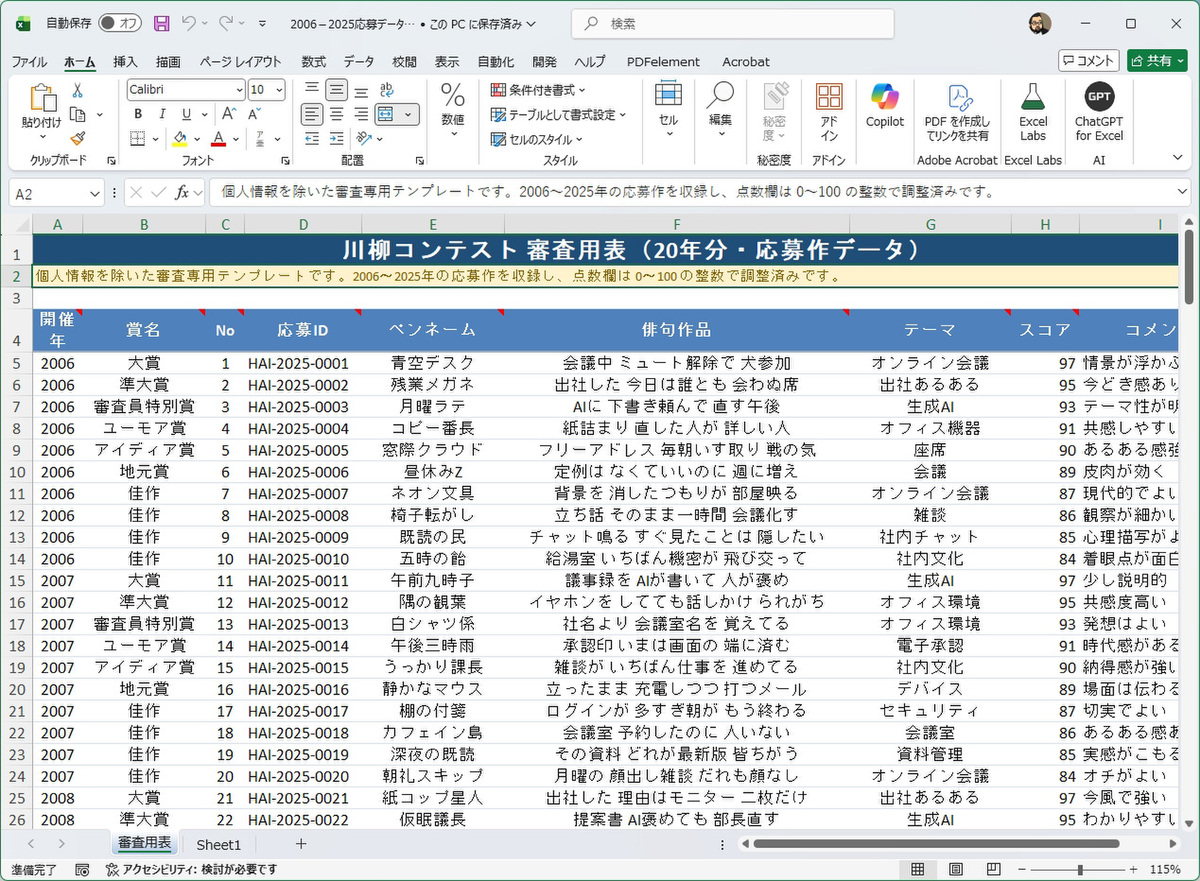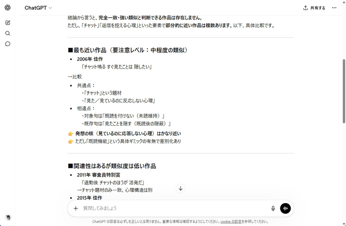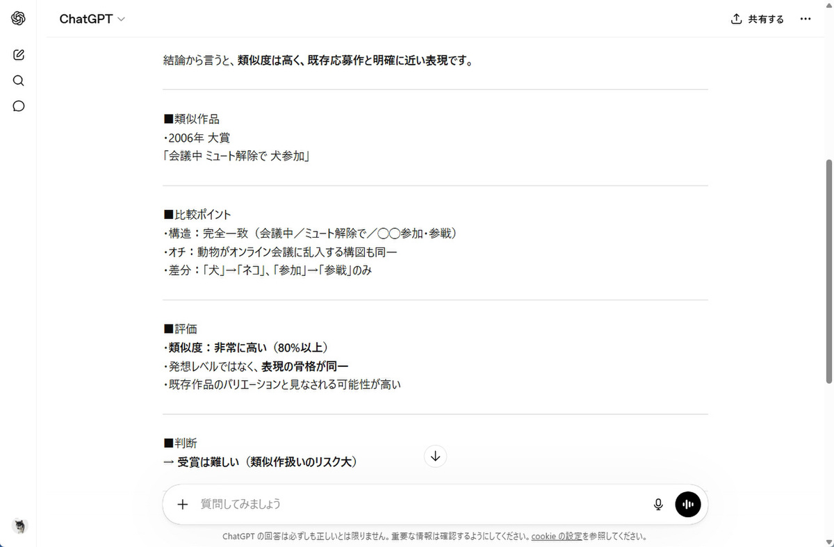 そんな時は、生成AIの出番だ。過去の応募作データを読ませれば、単語の一致だけでなく、発想や構図の近さまで見てくれる。今回は、過去の応募作をまとめたExcelファイルを使い、応募作品との類似をどこまで見抜けるのか試してみた。