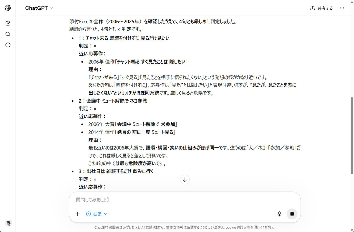 ちなみに、ユーザーに忖度して×を出しているのか確認するため、関係ない4句も判定させてみた。もちろん、すべて○判定となった。