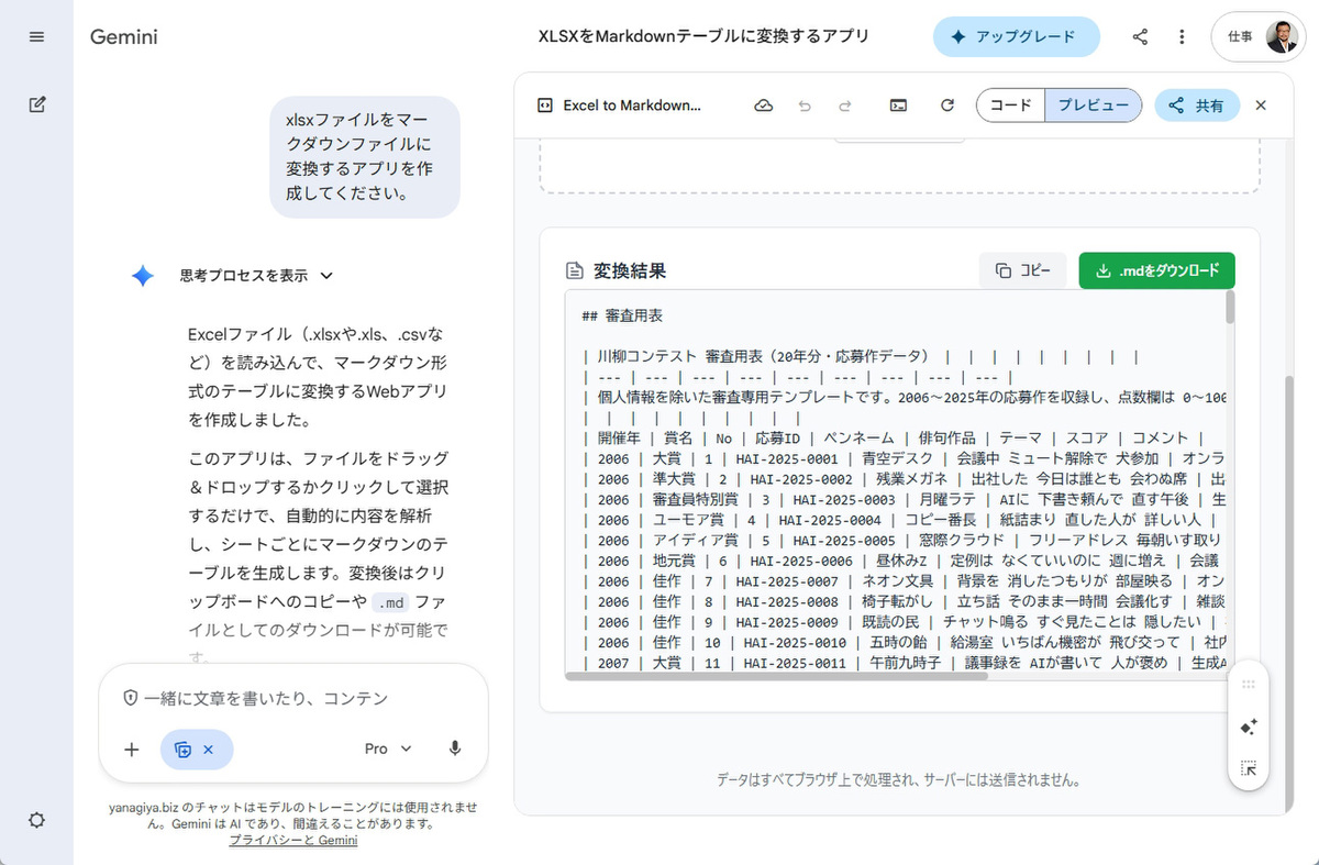 変換ツールがないなら作ればいい。Geminiの「Canvas」機能を選択し、「xlsxファイルをマークダウンファイルに変換するアプリを作成してください」と入力するだけ。すぐにウェブアプリが作成され、右側に表示される。Excelファイルをドラッグ&ドロップすると、.mdファイルをダウンロードできる。さらっと紹介したが、生成AIの登場によって世界が一変するほど便利になっていることを実感する。