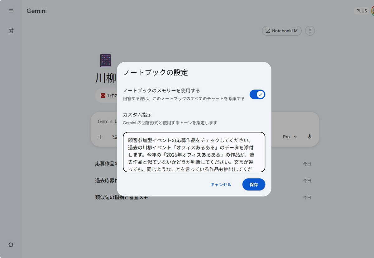 準備したマークダウンファイルをソースとして登録したら、次はカスタム指示を設定する。毎回プロンプトを入力することなく、応募作品をコピペすれば自動的にチェックが始まるようにできるのだ。ノートブックの右上にある「…」ボタンから「ノートブックの設定」で設定できる。