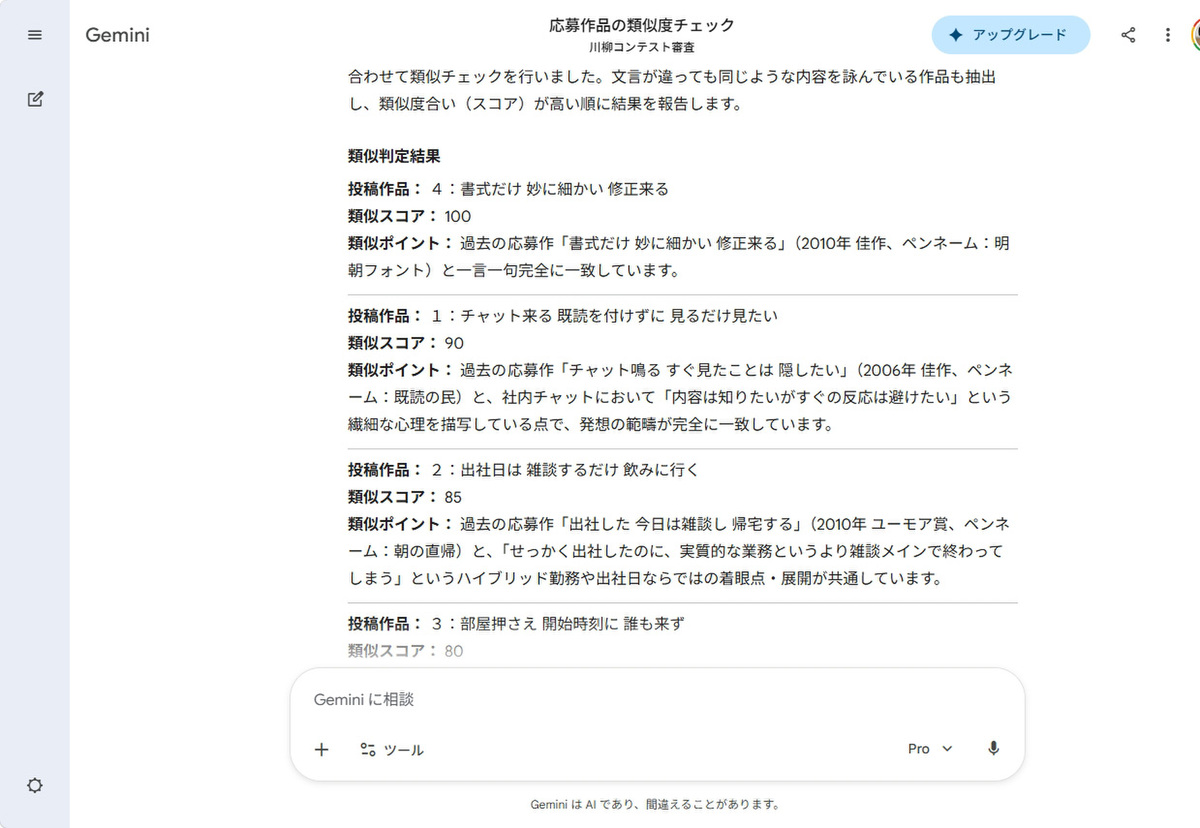 顧客参加型イベントの応募作品をチェックしてください。過去の川柳イベント「オフィスあるある」のデータを添付します。今年の「2026年オフィスあるある」の作品が、過去作品と似ていないかどうか判断してください。文言が違っても、同じようなことを言っている作品も抽出してください。類似度で、スコアを付け、高い順に表示してください。類似なしは出力しなくていいです。