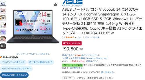 ASUSのノートパソコン「Vivobook 14 X1407QA-PU165W」が本日までのAmazonタイムセール対象。99,800円で販売中。