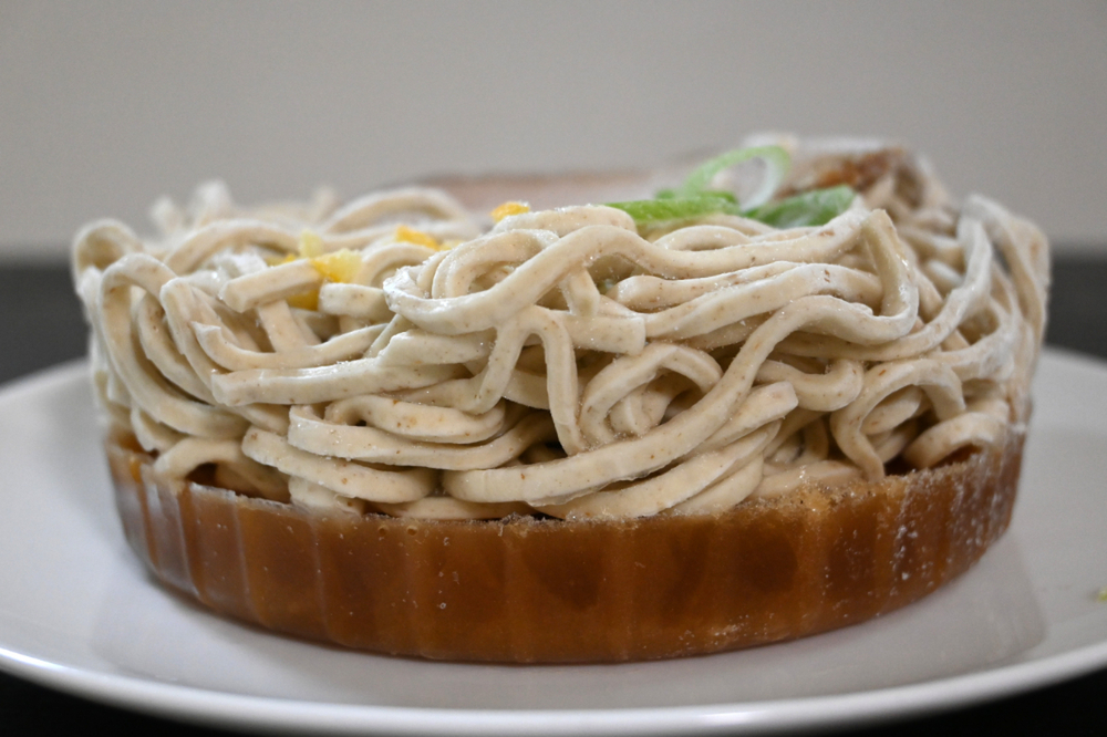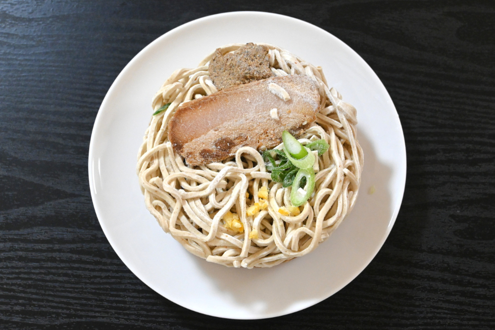 具体的には、粉砕してソテーしたミンチをオイルに加え、それをスープに合わせることで乳化させ、粒感とコクをプラス。さらに、魚粉はスープに直接混ぜるのではなく、チャーシューの下にペースト状で忍ばせ、最後に熱が入ることで香りが立つ設計にしたといいます。