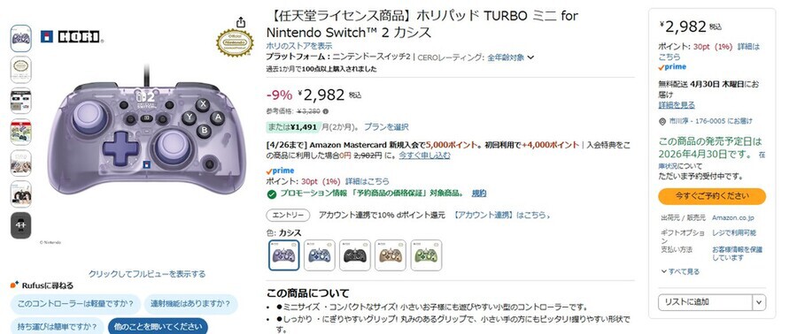 Amazon.co.jpにて、「【任天堂ライセンス商品】ホリパッド TURBO ミニ for Nintendo Switch 2 カシス」の予約を受付中だ。発売日は2026年4月30日。参考価格は3280円だが、執筆時点では9%オフの2982円で購入できる(4月20日時点)。