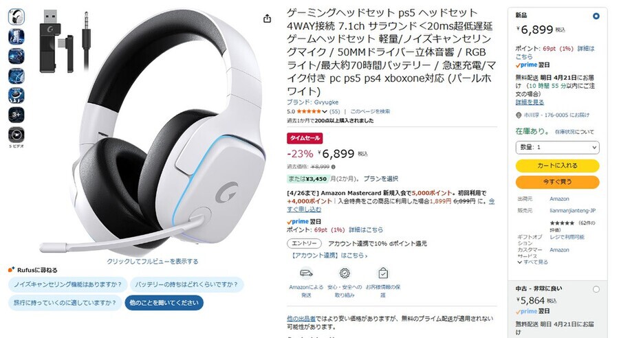 Amazon.co.jpにて、Gvyugkeのワイヤレスゲーミングヘッドセット「Captain 780」が販売中だ。過去価格は8999円だが、タイムセールにより23%オフの6899円で購入できる(4月20日時点)。