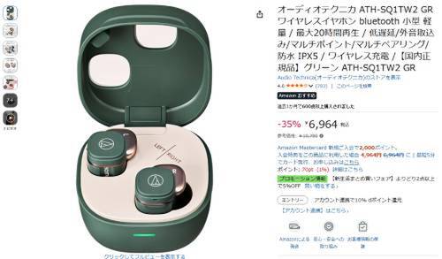オーディオテクニカのワイヤレスイヤホン「ATH-SQ1TW2」がAmazonで割引対象。参考価格10,780円のところ、35%オフの6,986円で販売中。