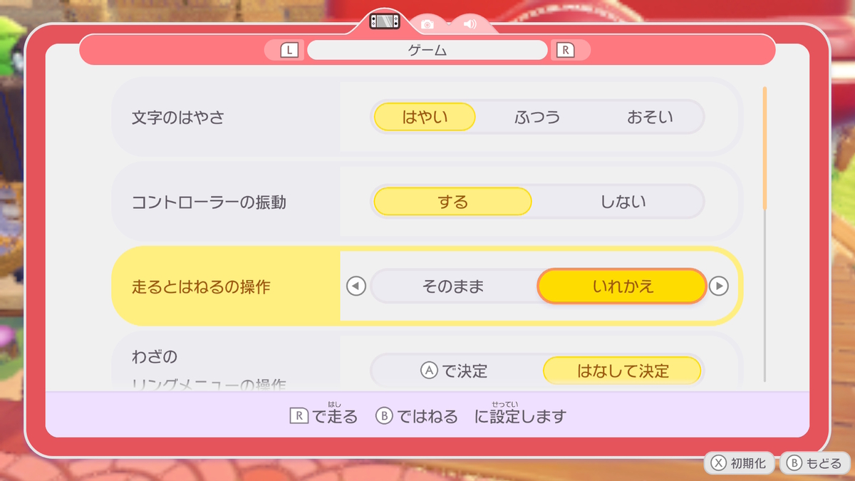 ③は人によるが、初期設定では「R」ボタンがジャンプになっている。これをオプションで「走るとはねるの操作」を「いれかえ」にすることで、「B」ボタンを押すとジャンプできるようになる。個人的にはBジャンプのほうが押しやすいと感じたので、うまくいかない人はお試しあれ。