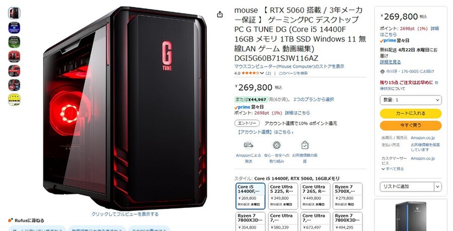 Amazon.co.jpにて、G TUNE(マウスコンピューター)のゲーミングPC「DGI5G60B71SJW116AZ」が販売中だ。価格は26万9800円。