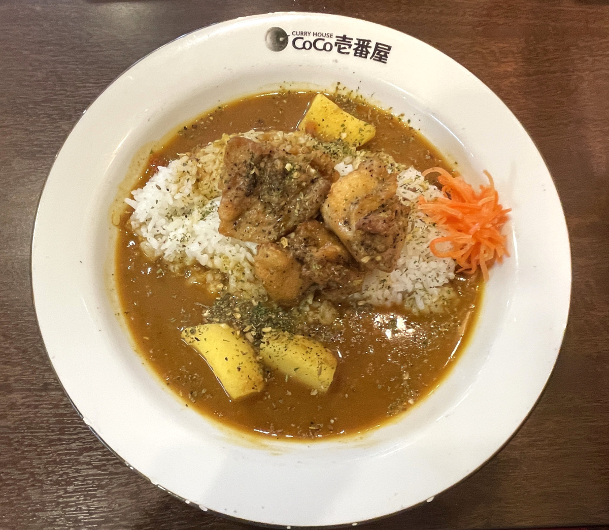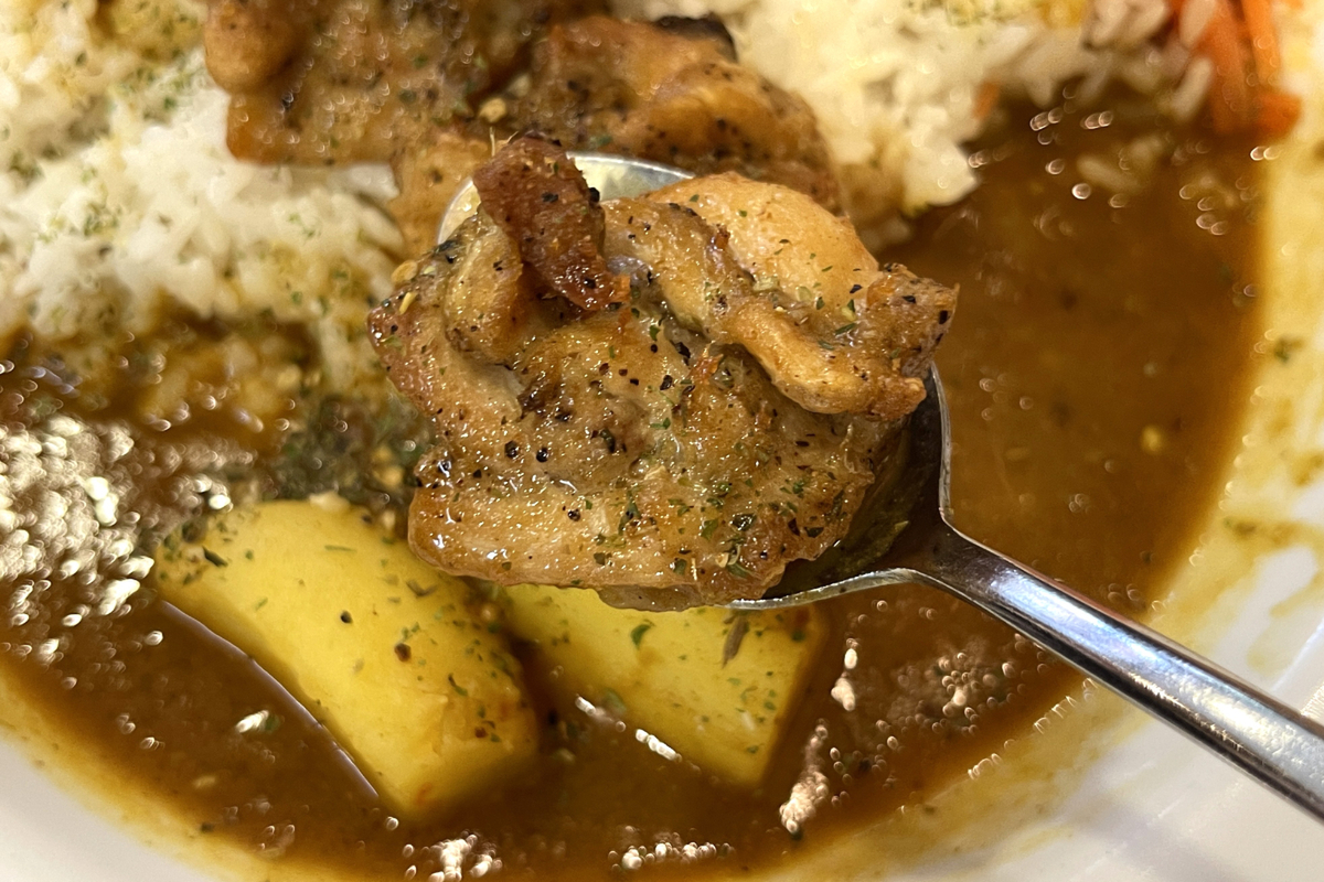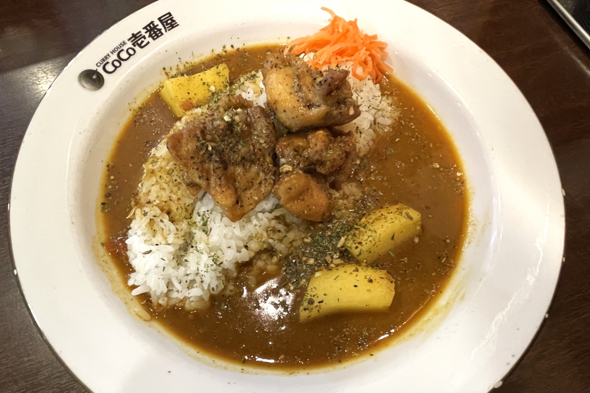 ゴロッと大ぶりにカットされたチキンに、これまたゴロッとした具材感のあるじゃがいも。カレーの表面にはスパイスがパラパラとかけられていて、見た目からして“いつものココイチ”じゃない雰囲気です。ニンジンのアチャール(インド風の漬け物)も添えられていて、彩りもいい感じ。