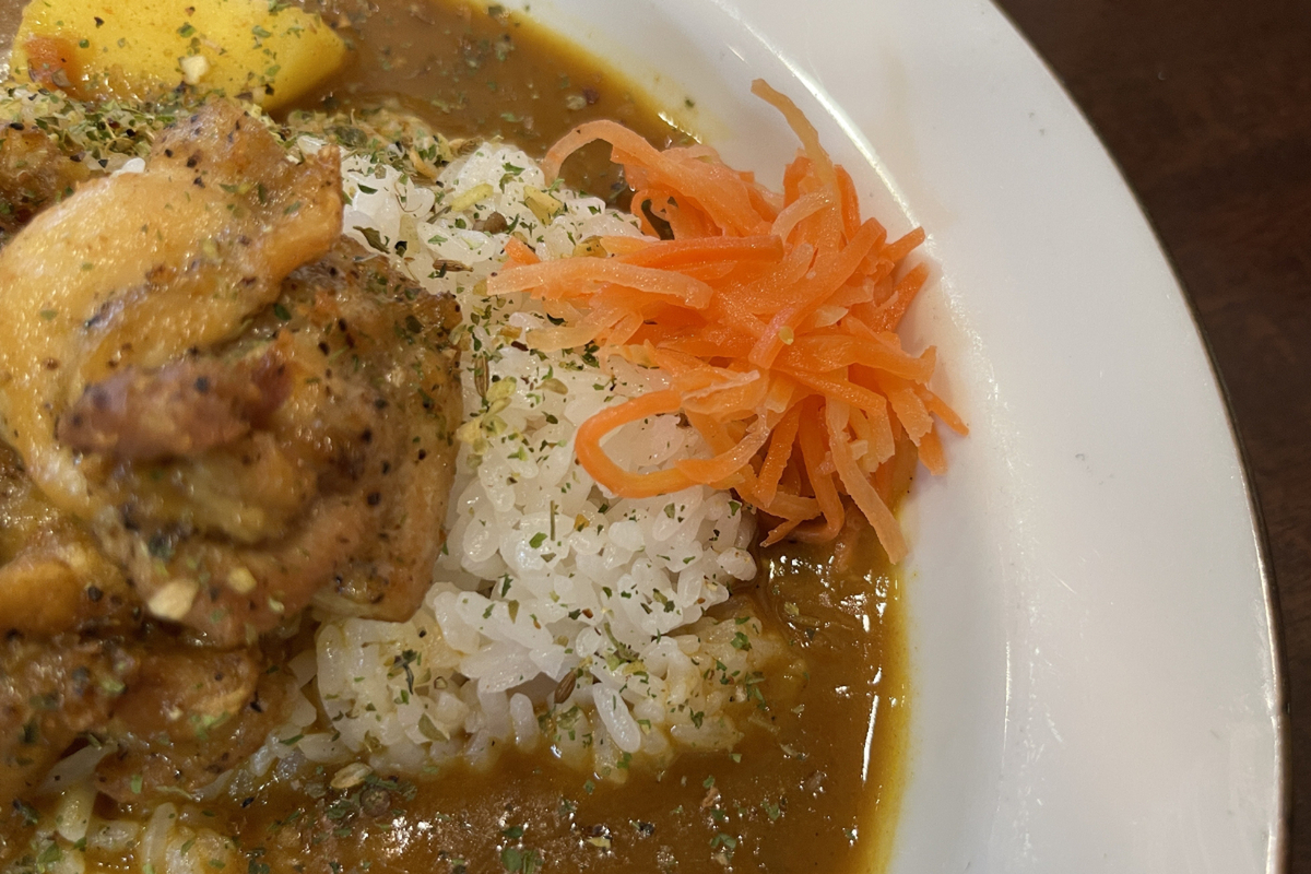 カレーを口に含むと、まずココナッツミルクのまろやかさ。そのあとを追いかけるように、複雑なスパイスが広がります。クミンやコリアンダーなど、爽やかな香気のスパイスが多く、ココナッツのやさしさと重なると、コントラストの妙というか、詫び寂びというか絶妙なバランス!