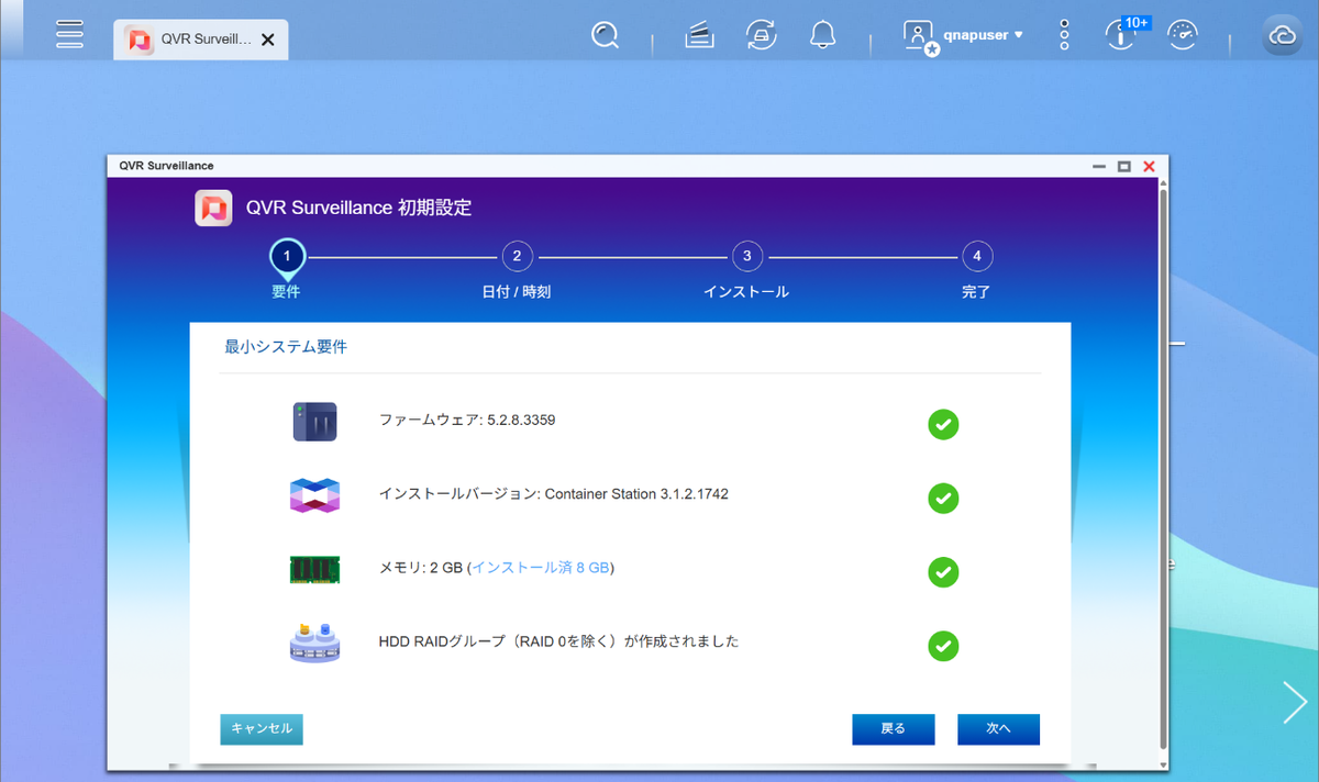 WebブラウザーでNASにアクセスするとOS「QTS」の画面が表示される。「App Center」から「QVR Surveillance」アプリのインストールを実行すると、まず動作する環境かチェックされる
