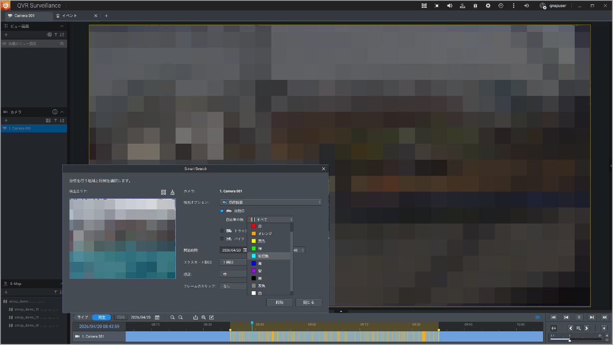 たとえば、道路に面したカメラで「青い車」という条件を指定すれば、録画データ内から該当する車両が映った場面だけをリストアップ。不審車両の特定にも役立つ。トラックやバイクのような車種も指定できるので、どういう車両の通行量が多いのかも可視化できる。