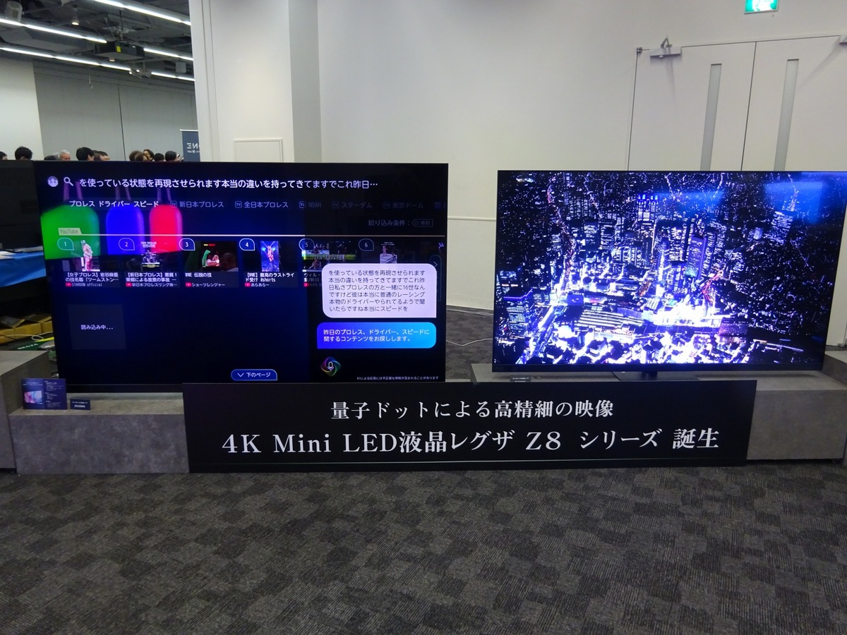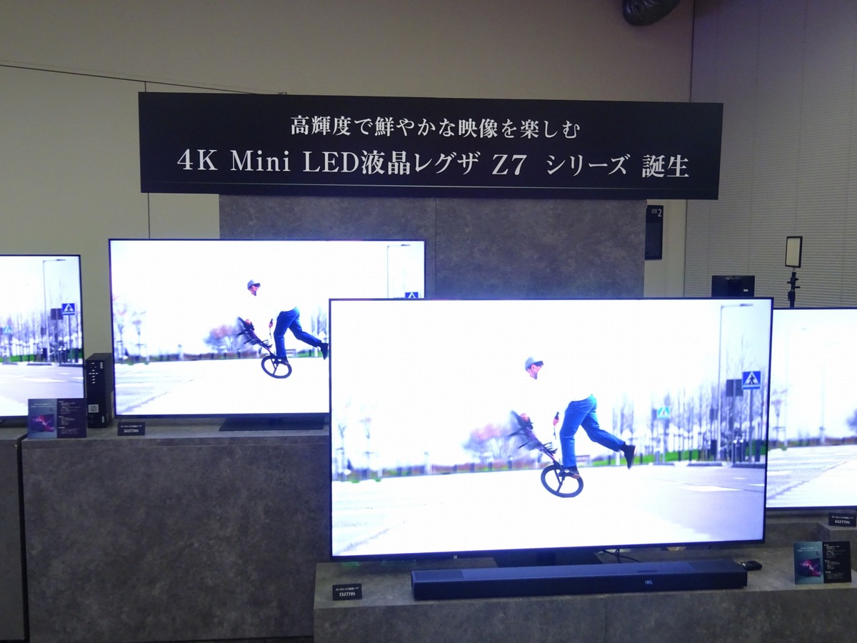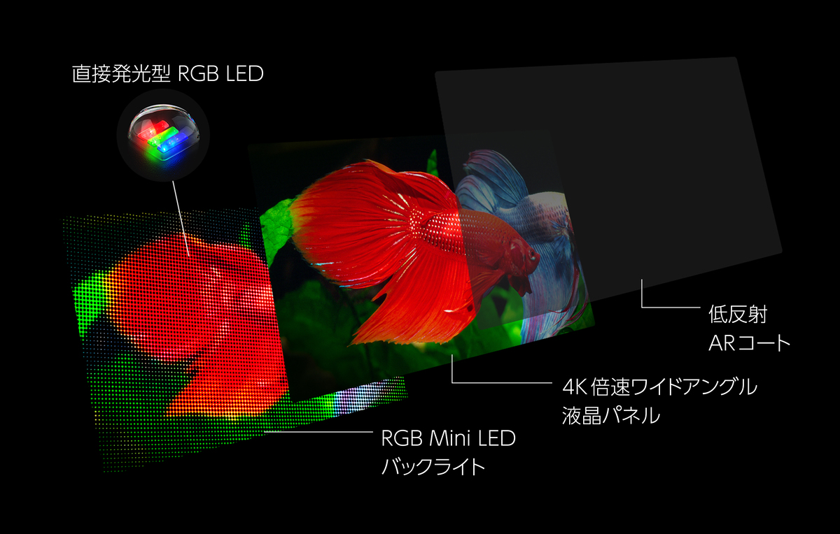 従来比約1.2倍となる新開発の高輝度Mini LEDバックライトを採用し、85V/75V/65V/55V型は広色域の量子ドットワイドアングル液晶パネルを搭載する。