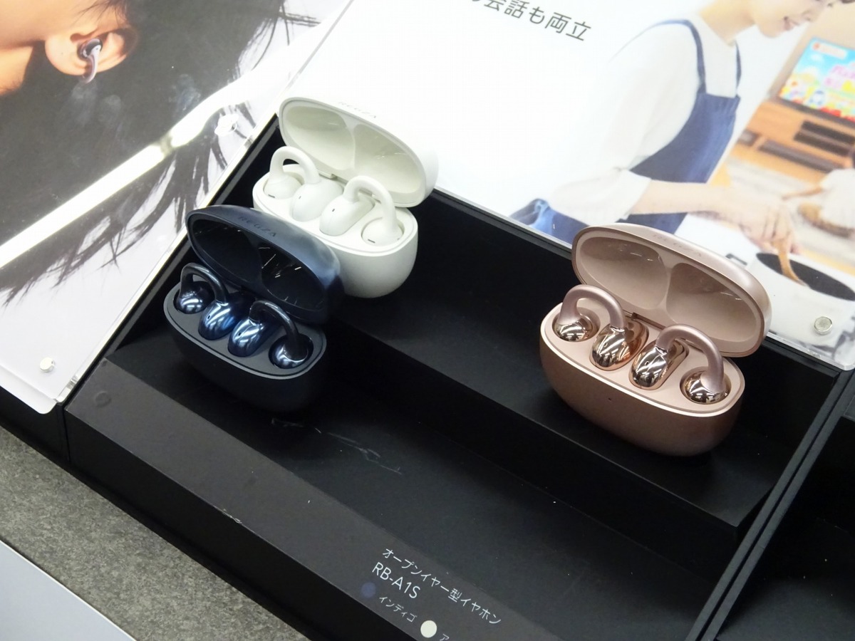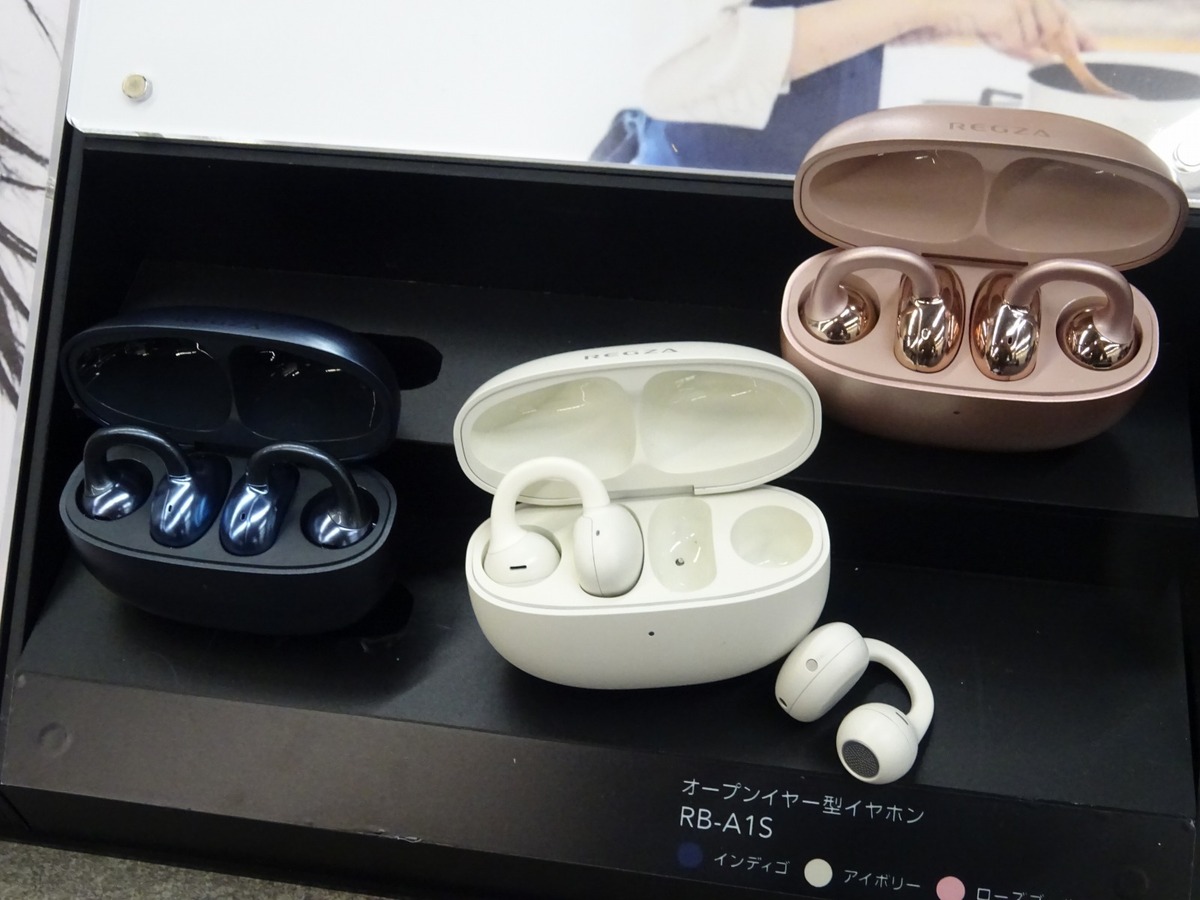 TVS REGZAは新カテゴリー商品として、オープンイヤー型イヤフォン「レグザイヤホン RB-A1S」を投入。ミュージック・シネマ・クリア音声モードを切り替えられ、指向性制御と逆位相フィルタリングによる音漏れ抑制技術も採用。重量は片耳約5.6gでカラバリはインディゴ、アイボリー、ローズゴールドの3色を展開。価格はオープンプライスで5月22日発売予定。