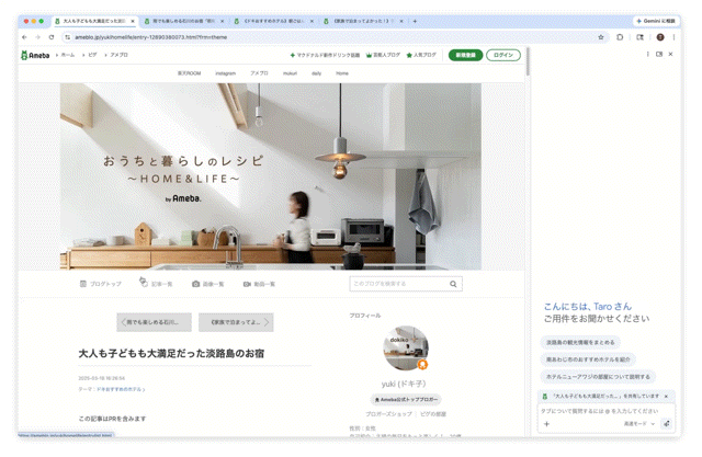 旅行計画のような複雑な調査作業にも対応する。たとえばシンガポール旅行のパッケージ一覧ページを開いた状態で「これらのパッケージを比較して」と指示すると、複数の選択肢を整理した比較表をその場で生成する。さらに、過去の会話からユーザーの家族構成や好みを把握しているため、「私の家族に最適なのはどれ?」と質問すれば、個人の事情に合わせたパーソナライズされた提案も可能だ。複数のタブを横断して情報を収集・比較する機能も備えており、複数のブログ記事を横断したホテル比較表の作成なども可能だという。