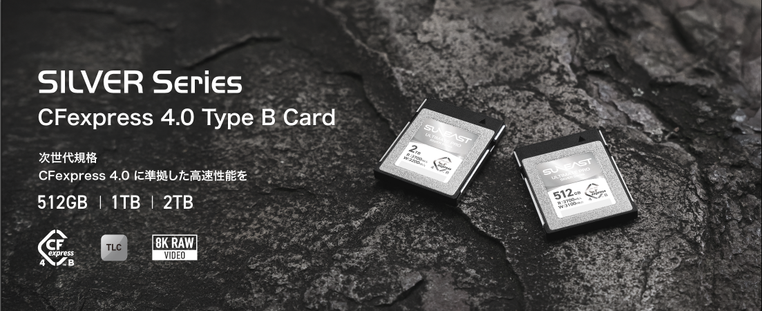 SUNEASTの新製品「ULTIMATE PRO SILVER Series」は、次世代規格CFexpress 4.0に対応。高速データ転送が可能なPCIe Gen4インターフェースを採用し、従来のCFexpress Type Bカードに比べて大容量データの転送や編集作業が効率的に進むとしている。