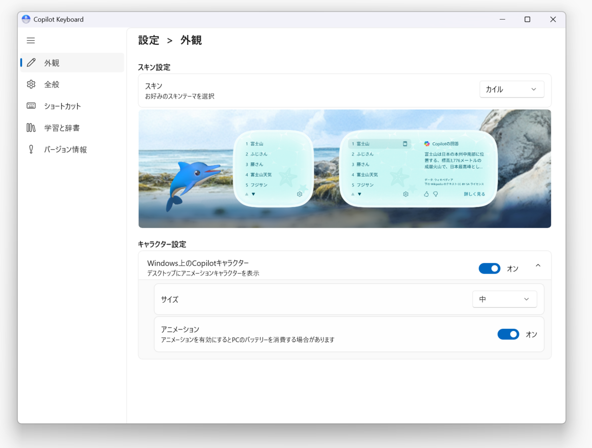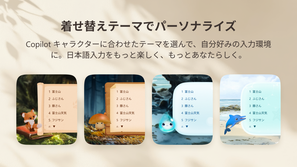 そしてCopilot キャラクターの着せ替え機能もポイントだ。お気に入りのキャラクターを選んで、着せ替えテーマで自分好みの入力環境にカスタマイズできる。