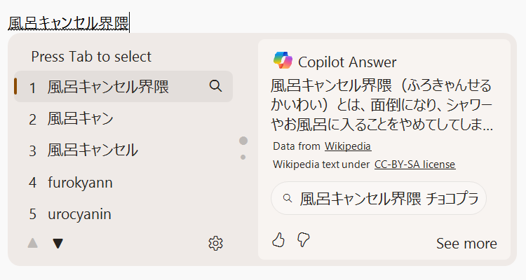 またCopilot Searchとの連携も大きな特徴の1つ。文章を書いていると、意味を調べたり、言い換えを探したりするシーンが多く発生するが、Copilot Searchと連携することで変換候補からシームレスに検索が可能となっている。