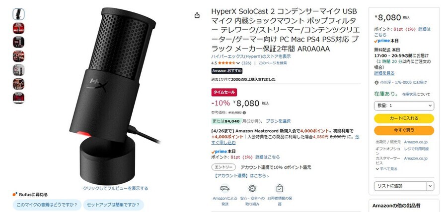 Amazon.co.jpにて、HyperXのコンデンサーマイク「HyperX SoloCast 2」が販売中だ。参考価格は8980円だが、タイムセールにより10%オフの8080円で購入できる(4月21日時点)。
