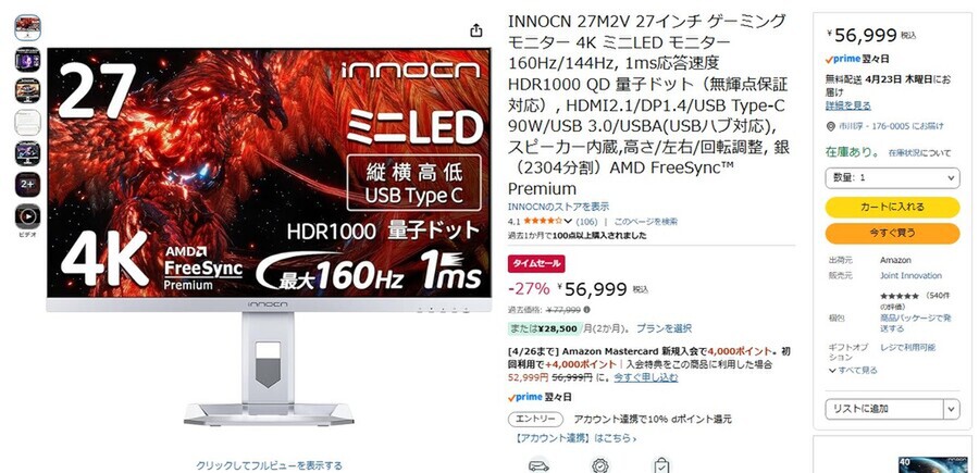 Amazon.co.jpにて、INNOCNの27型4Kゲーミングディスプレー「27M2V」が販売中だ。過去価格は7万7999円だが、タイムセールにより27%オフの5万6999円で購入できる(4月21日時点)。