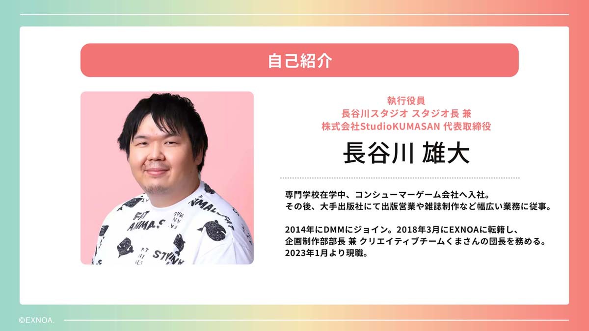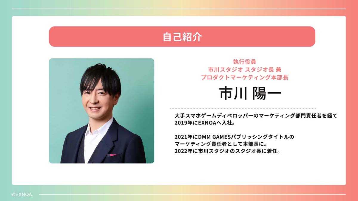 同氏は、スタジオ長であるとともに、ゲームのプロデュースも担当。同スタジオでは、男性向けと女性向け、どちらのタイトルも運営・配信しており、「最高の“喜び”を生むコンテンツを作る」をモットーに、長く愛されるタイトルの開発を目指しているという。