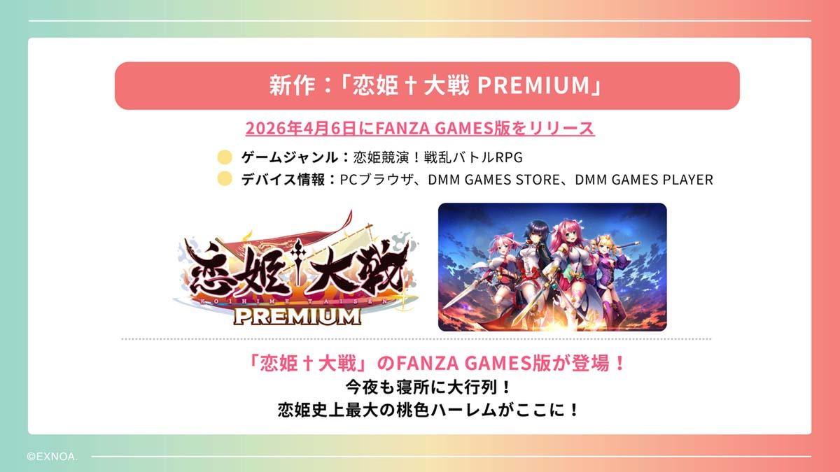 本スタジオは、既存のDMM GAMESにはない、新しい価値を見い出すことをミッションとしているという。直近のタイトルとしては、4月6日に『恋姫†大戦 PREMIUM』をFANZA GAMESでリリース。