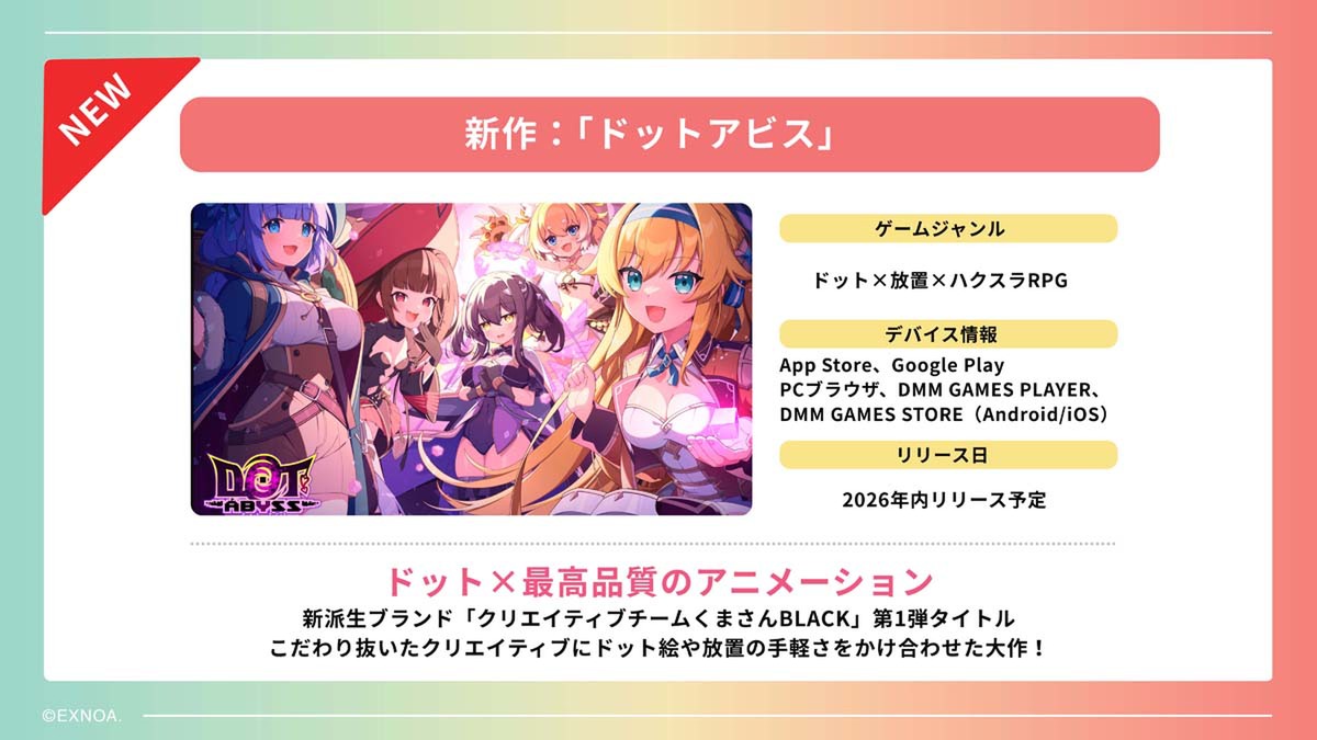 本レーベルのタイトルとしては、4月14日より事前登録を開始した『ドットアビス』がある。