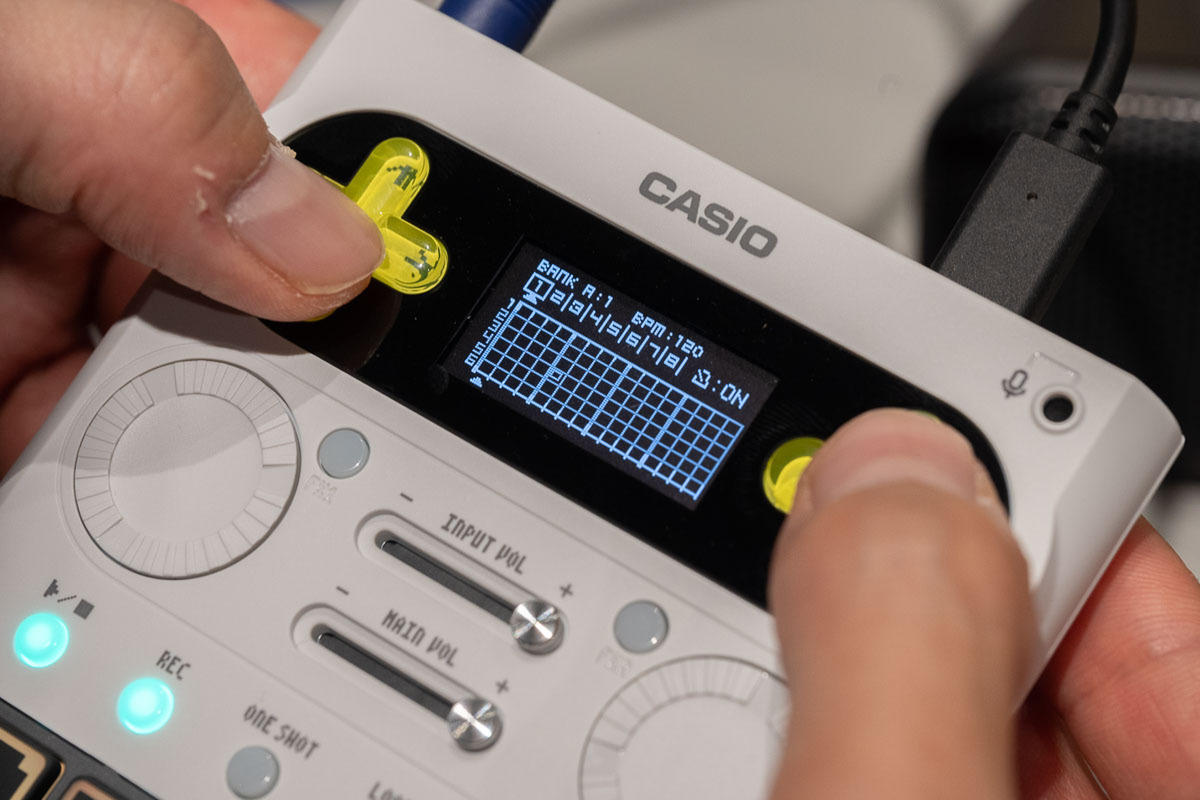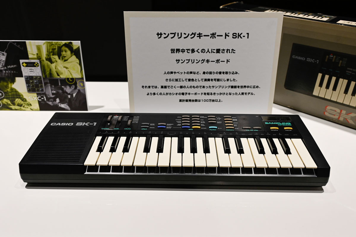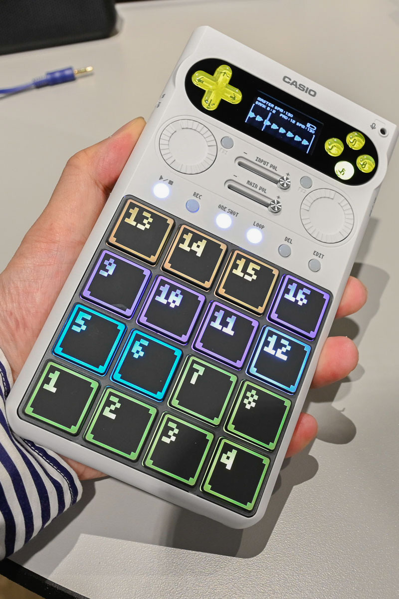 石崎氏は、この仕様について「過去のカシオの伝説的音源である『SK-1』や『MT-40』のサウンドも内蔵している」と言及。懐かしくも新しい音の素材を、膨大な容量を気にすることなく自由に配置し、ビートシンクやエフェクターを用いて即座に楽曲へと昇華できる仕組みについて紹介した。
