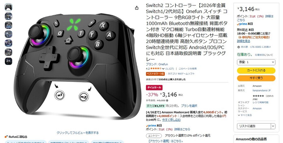 Amazon.co.jpにて、「Onefun Switch 2コントローラー」が販売中だ。参考価格は5000円だが、タイムセールにより37%オフの3146円で購入できる(4月21日時点)。