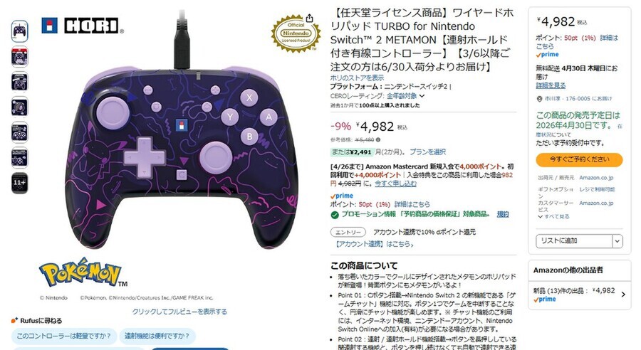 Amazon.co.jpにて、ホリの「【任天堂ライセンス商品】ワイヤードホリパッド TURBO for Nintendo Switch 2 METAMON」の予約を受け付けている。発売日は2026年4月30日。参考価格は5480円だが、執筆時点では9%オフの4982円で購入できる(4月21日時点)。