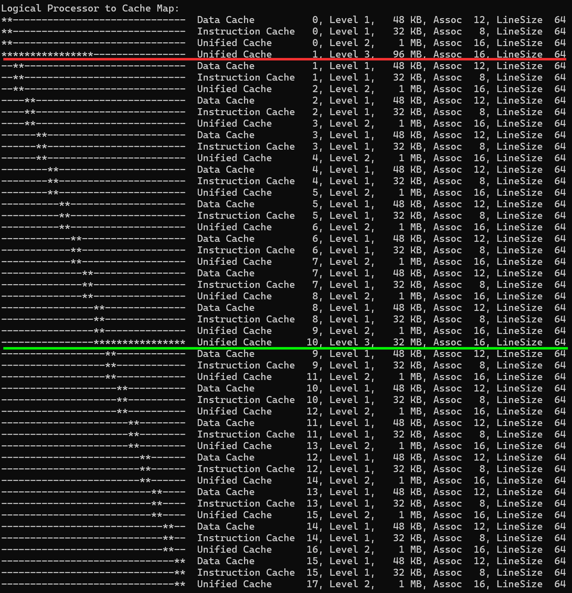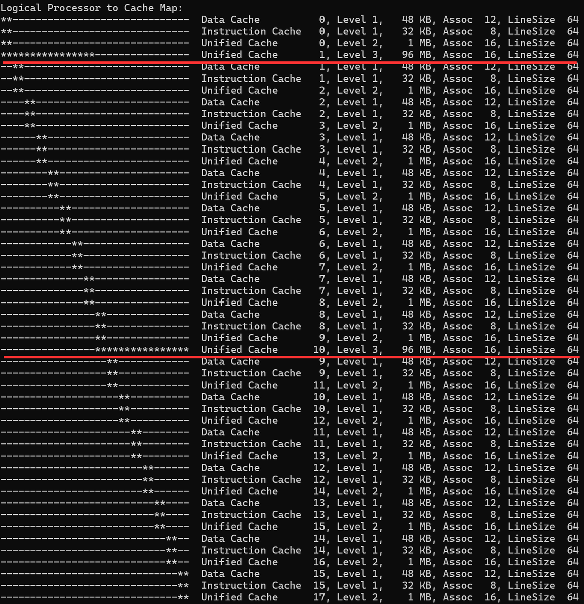 CPUのコアおよびキャッシュのマッピングを「coreinfo」で取得した。Ryzen 9 9950X3D2の場合、2基の巨大なL3キャッシュ(Unified Cache, Level 3。赤線部)は両方とも96MBであり、おのおのに対し8基の物理コアがぶら下がっている