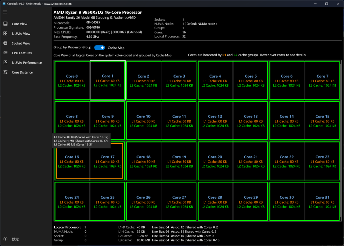 ちなみにcoreinfoにはGUI版「coreinfoEx」も同梱されている。コア16をクリックすると96MBのL3キャッシュがコア16-31間で共有されているのが分かる。ちなみにこのツールではRyzen 9 9950X3D2のベースクロックが4.2GHzとなっていた(公式には4.3GHz)