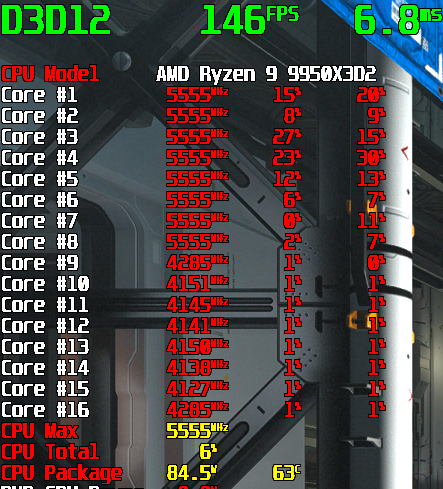 今回の検証中に配信開始となった「PRAGMATA」での動作例。Ryzen 9 9950X3D2においても、ゲームの処理は片方のCCDに集中する(クロック表示の右2つが、各物理・論理コアにおけるコア占有率)