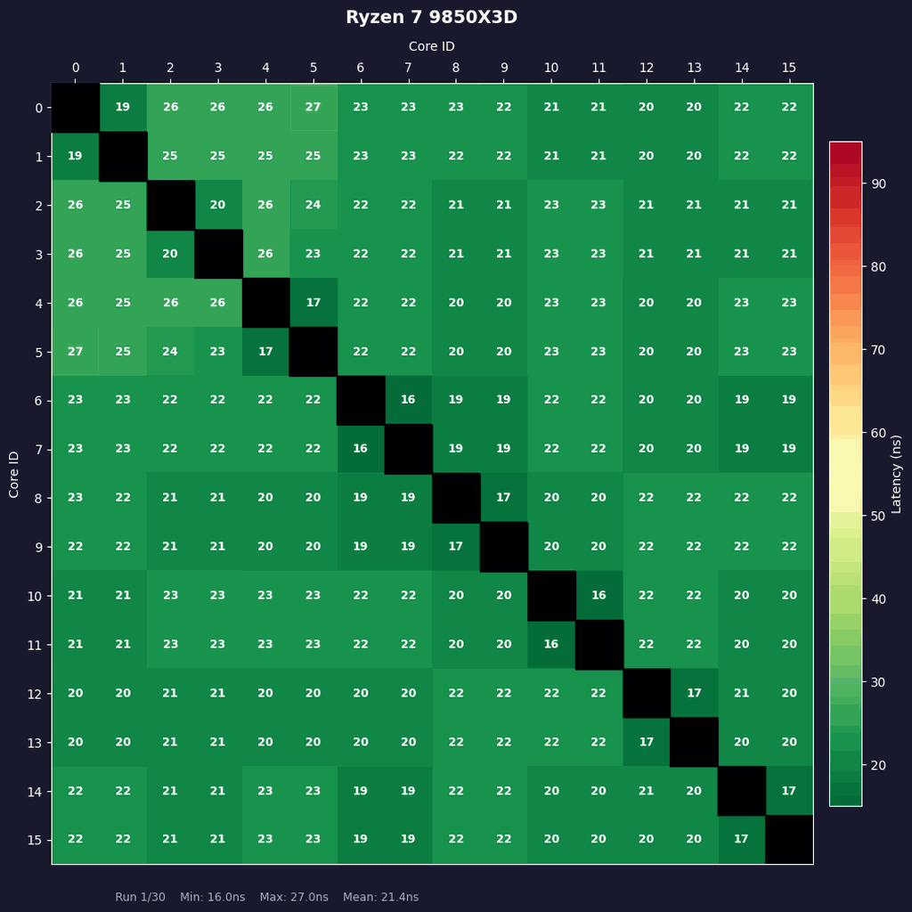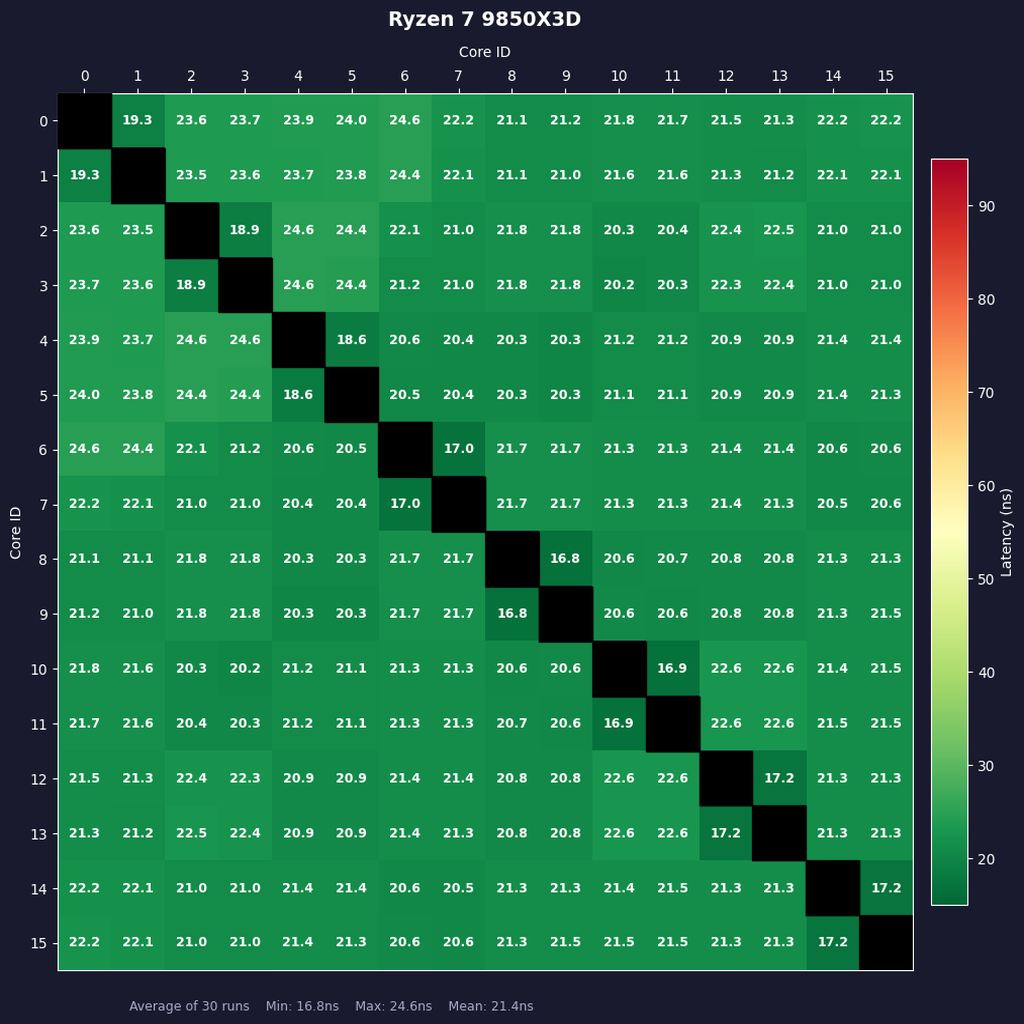 上図において特にレイテンシーの短いペア(コア0-コア1およびコア1-コア0)は、SMTによって生まれた物理コア-論理コアのペアであることを示している。それを除外しても、1CCDで完結するRyzen 7 9850X3Dのコア間レイテンシーはどのコアにおいても極めて短い。