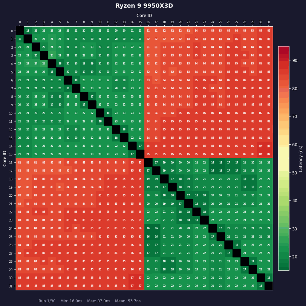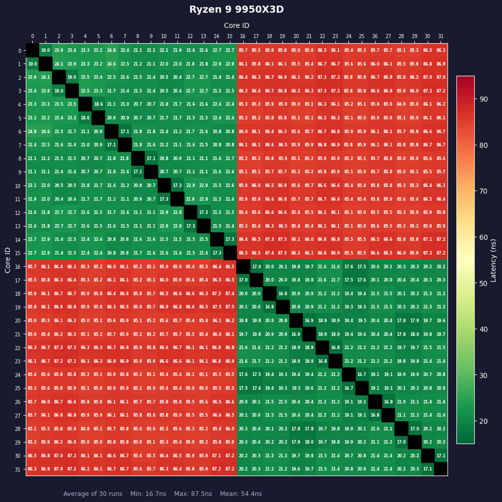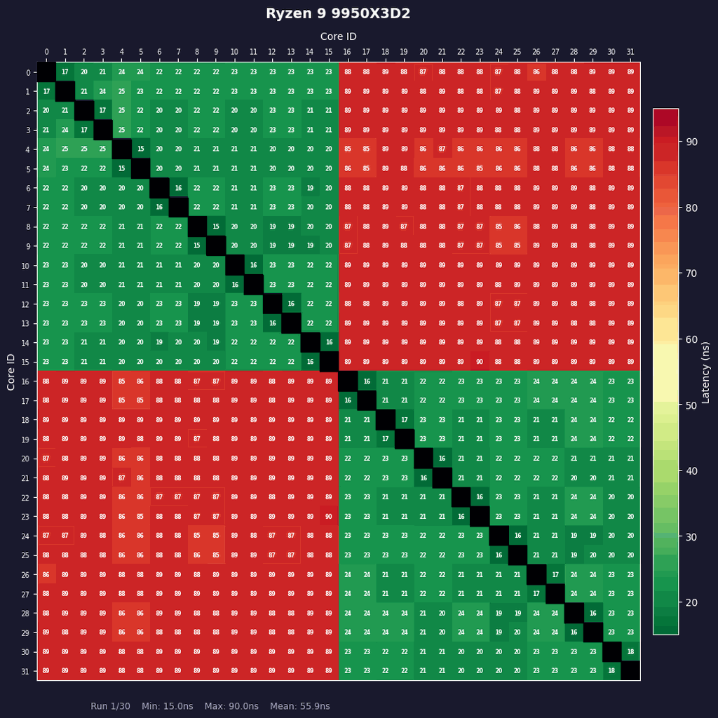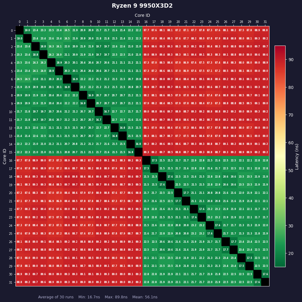 2CCDで構成されているRyzen 9 9950X3Dおよび9950X3D2のコア間レイテンシーは同一CCD内か外かで極端に異なる。CCDをまたぐコア間のレイテンシーは85〜93nsと非常に大きい。Ryzen 9は8コアのRyzenを2つくっつけたような構造なっていることがよくわかる。