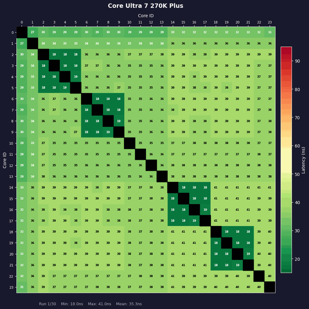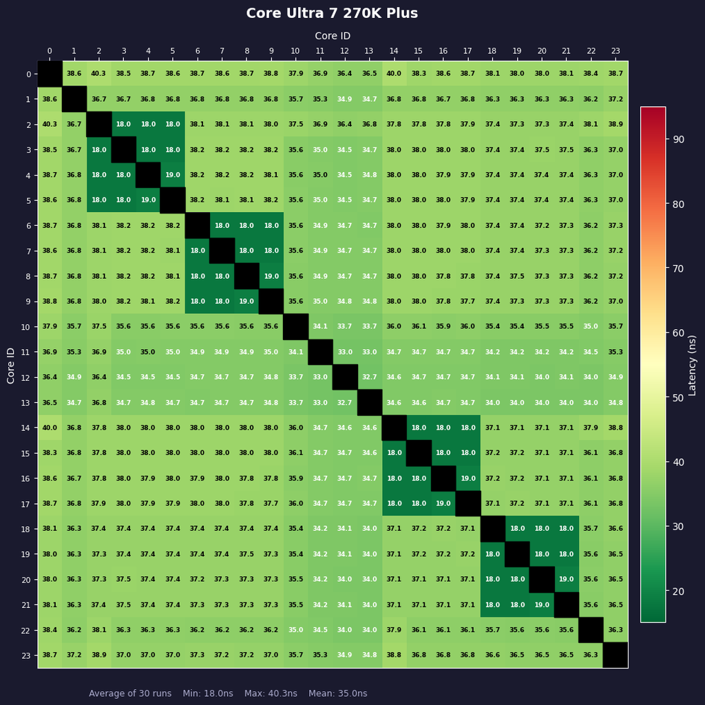 こうして同じスケールで比較すると、Core Ultra 7 270K Plusのコア間レイテンシーは全体的にとても小さくまとまっていることが分かる。ただコア間レイテンシーはCPUの性能のすべてではないし、インテル製CPUにはハイブリッドデザインであるがゆえのクセ、アーキテクチャーに依存する電力効率問題があるという点を忘れてはならない。