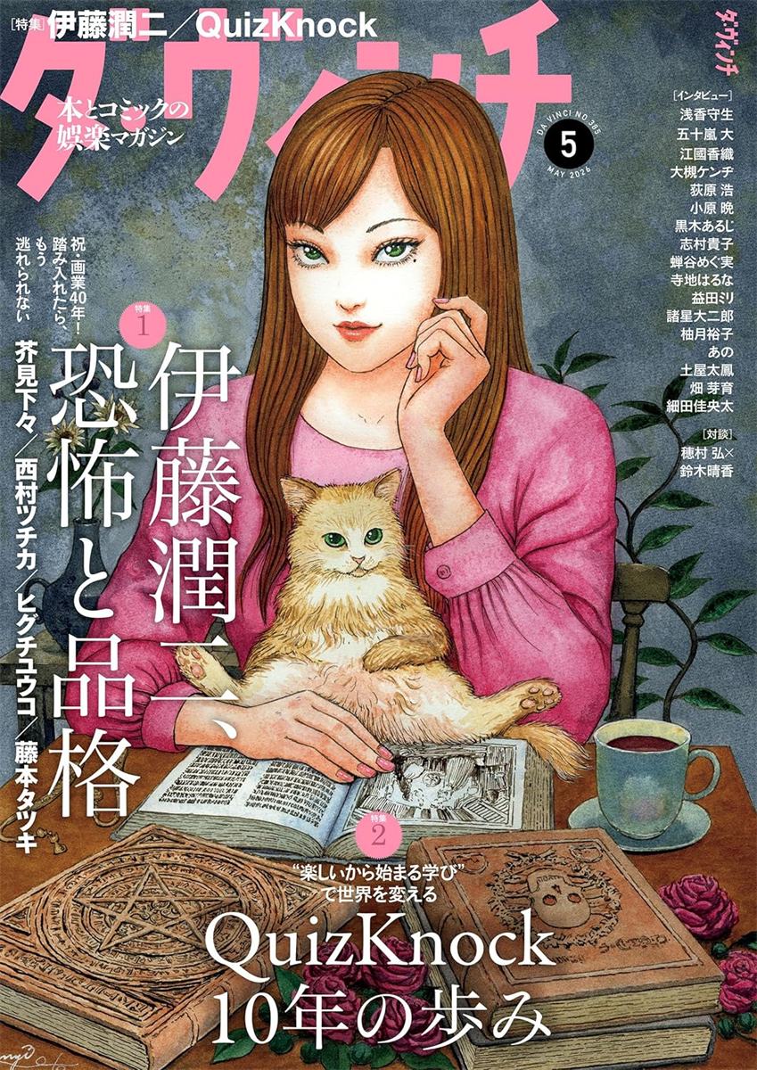「本とコミックの娯楽マガジン『ダ・ヴィンチ』2026年5月号の第1特集は、「伊藤潤二、恐怖と品格」。1986年、「富江」が『月刊ハロウィン』(朝日ソノラマ)新人漫画賞「楳図賞」で佳作を受賞し、デビューした伊藤潤二さん。その後、「道のない街」「首吊り気球」や、「双一」シリーズ、『うずまき』など、数多の名作を生みだし続けてきた。