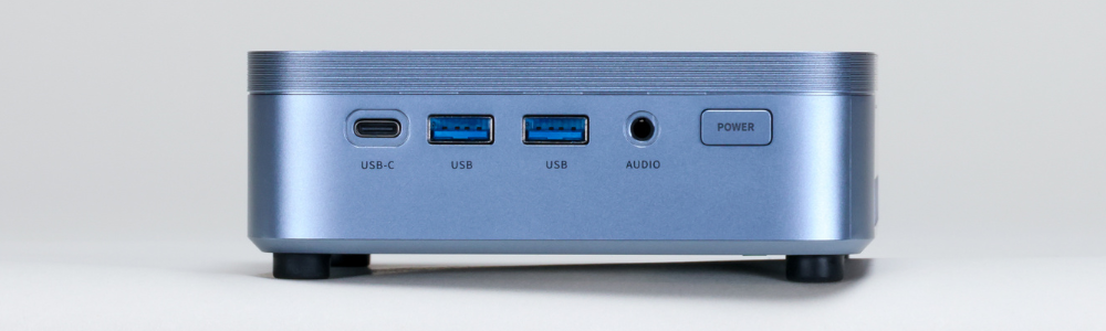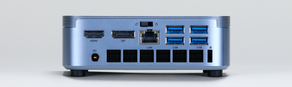 小型PCで犠牲になりがちなポート類ですが、M5には一切の妥協がありません。映像出力はHDMI 2.0、USB3.2 Gen 2 Type-C、DisplayPort 1.4bを備え、最大で4K・3画面同時出力に対応も可能です。
