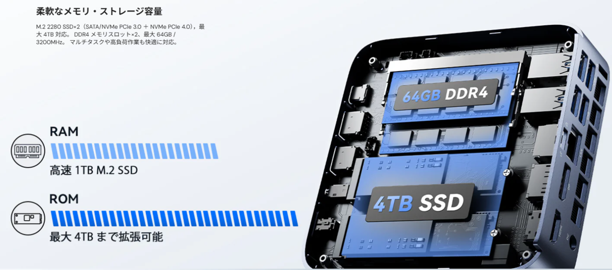 さらにこのマシンは、長く使える拡張性もあります。必要になればメモリは最大64GBまで、SSDは合計4TBまで増設・換装が可能です。これだけの拡張性があれば、いざスペックが足りなくなった時も安心ですね。