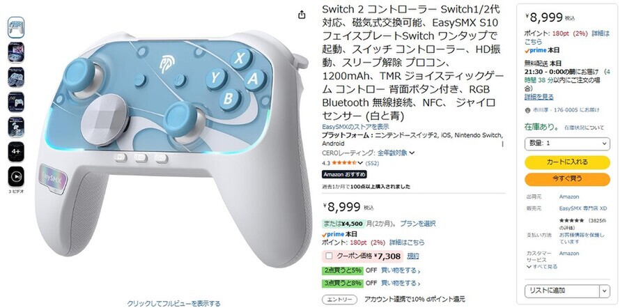 Amazon.co.jpにて、Nintendo Switch 2用コントローラー「EasySMX S10」が販売中だ。価格は8999円だが、クーポンを適用すると7308円で購入できる(4月22日時点)。