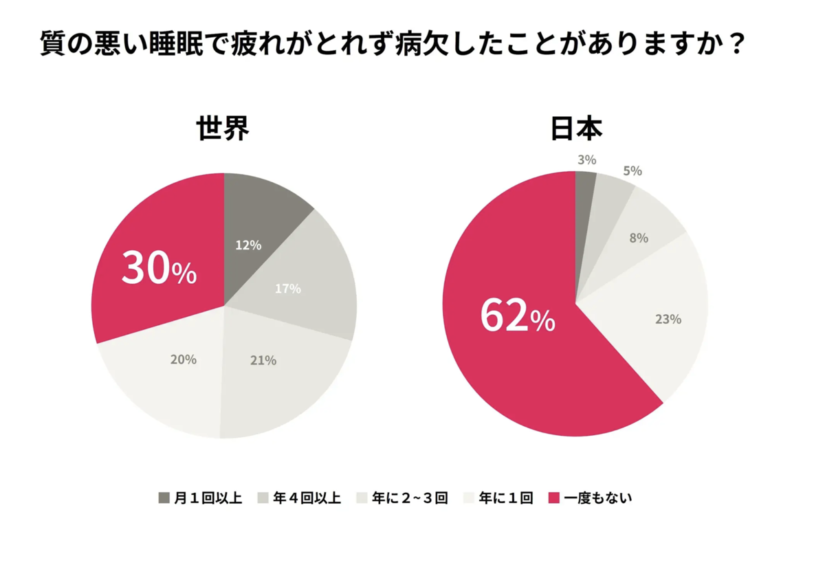 労働環境に関する調査では、「質の悪い睡眠による疲労で病欠したことがない」と回答した日本人は61.5%で、世界平均29.6%と比べて大きな差が見られました。また、「上司が健康を気にかけている」と感じる人は26.4%、「職場が休息を重視している」は24.8%にとどまりました。