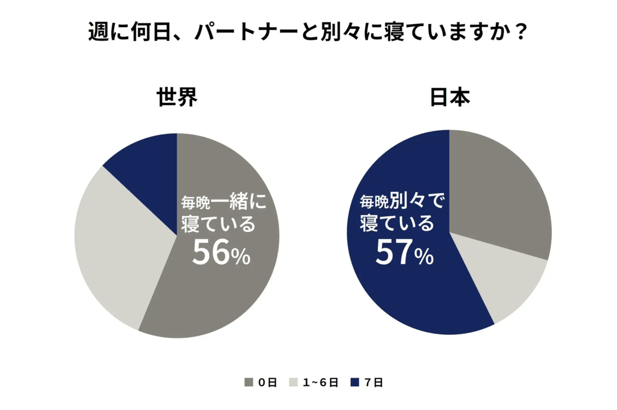 就寝環境については、パートナーと別々に寝る「睡眠離婚」の割合が57.2%で世界最高となりました。これは生活リズムの違いなどに対応する手段とされる一方、睡眠時無呼吸症候群などの兆候を見逃す可能性も指摘されています。
