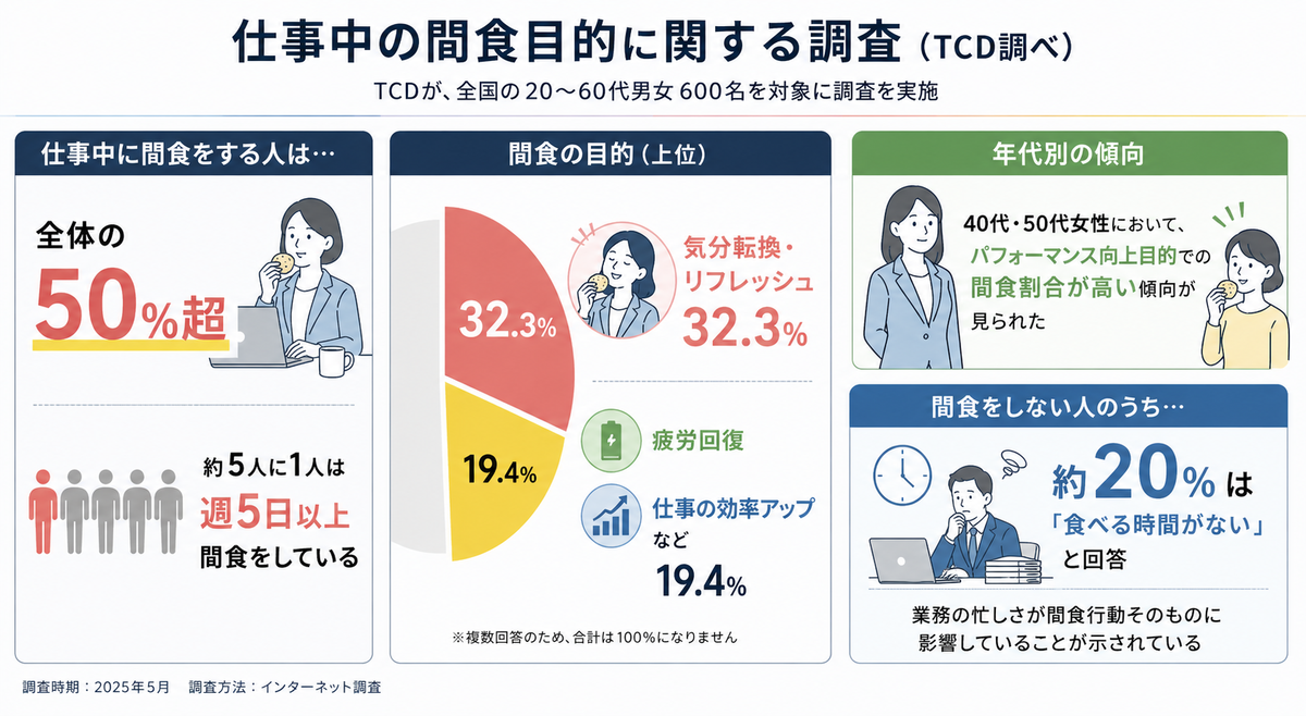 とある調査によると、仕事中に間食をする人は半数を超え、約5人に1人は週5日以上という高頻度で“もぐもぐタイム”を取り入れているという。