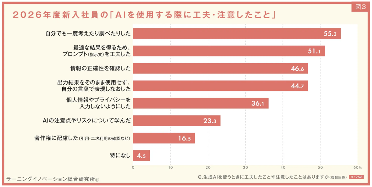 AI利用時の工夫として「自分でも一度考える」が55.3%、「プロンプトの工夫」が51.1%、「情報の正確性確認」は46.6%、「出力の言い換え」は44.7%だった。