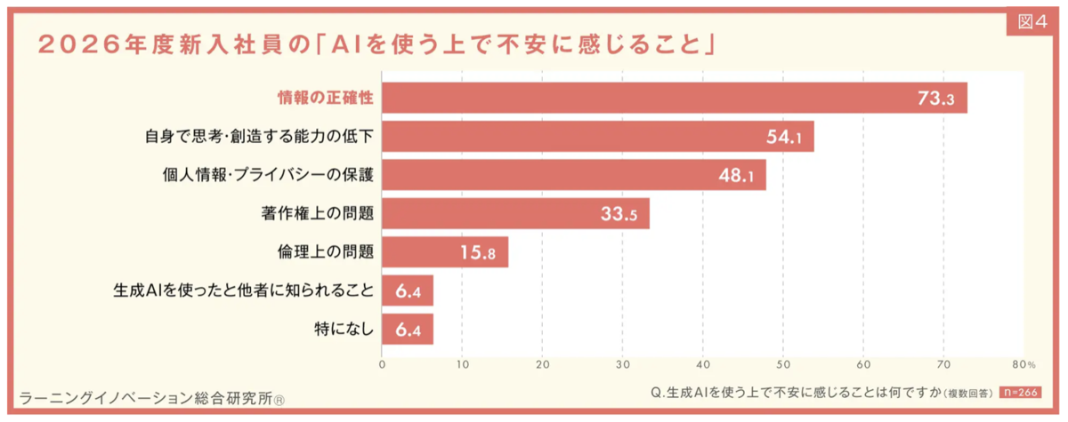 AI利用の不安については「情報の正確性」が73.3%で最も高く、「思考・創造力の低下」54.1%、「プライバシー」48.1%、「著作権」33.5%が続いた。