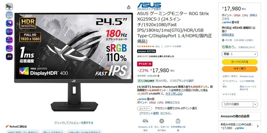 Amazon.co.jpにて、ASUSの24.5型フルHDゲーミングディスプレー「ROG Strix XG259CS-J」が販売中だ。過去価格は2万3400円だが、タイムセールにより23%オフの1万7980円で購入できる(4月22日時点)。
