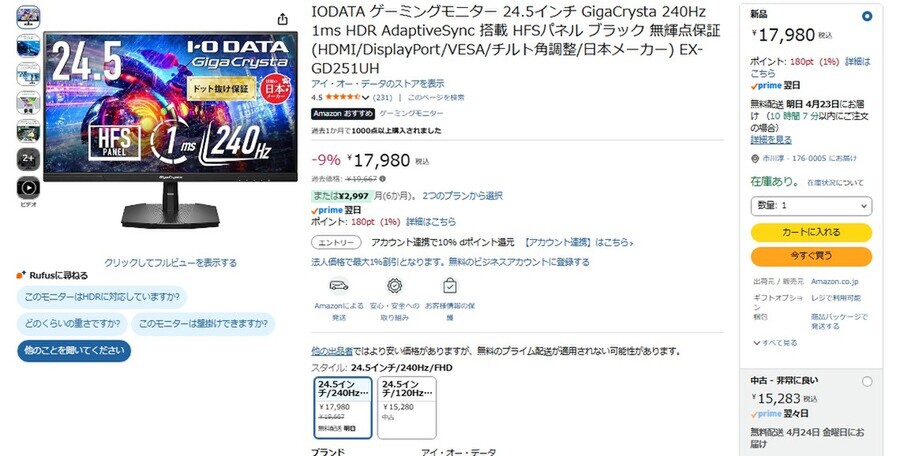 Amazon.co.jpにて、アイ・オー・データ機器の24.5型ゲーミングディスプレー「GigaCrysta EX-GD251UH」が販売中だ。過去価格は1万9667円だが、執筆時点では9%オフの1万7980円で購入できる(4月22日時点)。