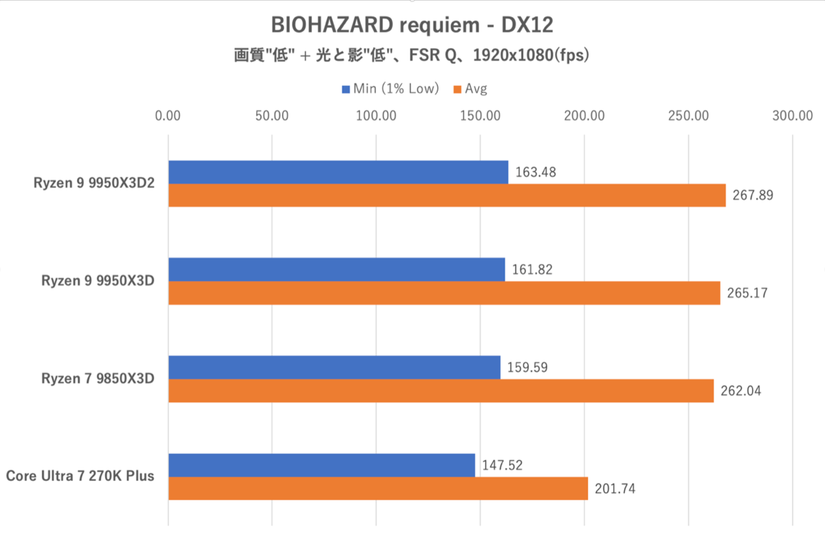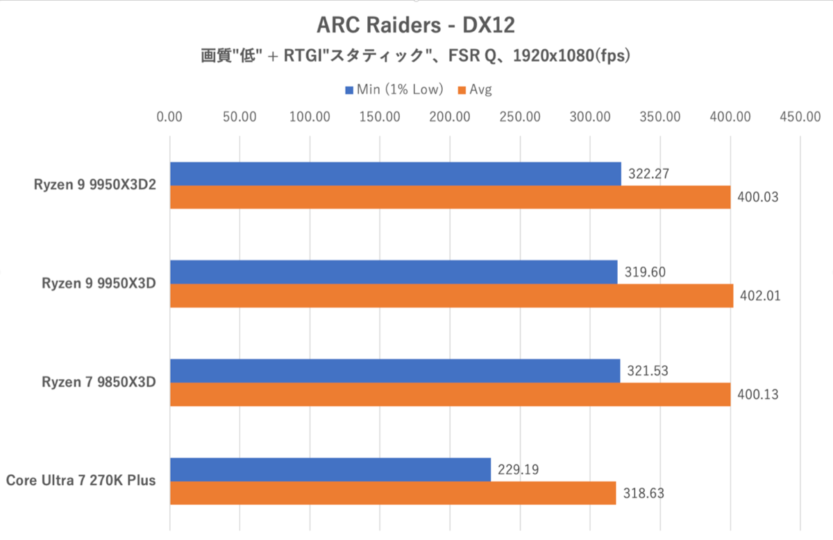 Core Ultra 7 270K Plusが完全に3D V-Cache搭載Ryzenに置き去りにされているのが分かるが、Ryzenの中ではどのCPUも決定的な差は出ていない。強いて言えば非対称な3D V-Cacheを持つRyzen 9 9950X3Dの最低フレームレートが低いと言えなくもないが、他のCPUとの差が小さすぎる。Ryzen 9 9950X3D2のメリットはまったく感じられない。
