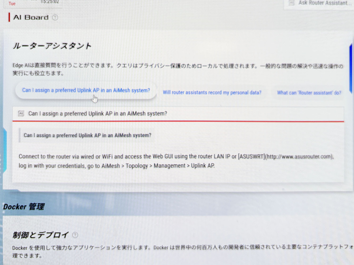 操作がわからないときや、ルーターに問題が起きた時などは、Private Edge AIに質問すればAIが答えてくれる。ローカルで処理されるため、通信環境がなくても一般的な問題の解決や、迅速な制御操作の実行に利用できる(現在は英語のみ対応)