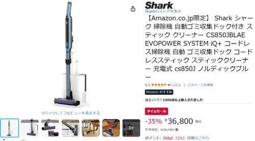 Sharkのコードレス掃除機「EVOPOWER SYSTEM iQ+(CS850JBLAE)」がAmazonでタイムセール対象。参考価格56,980円のところ、35%オフの36,800円で販売中。